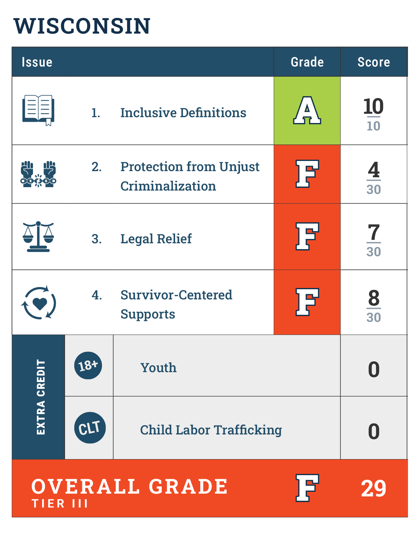 Since 2011, Shared Hope has supported policymakers and advocates in enacting key laws to combat child and youth sex trafficking. Building on this foundation, the Just Like Me Report Cards grade states based on a Top Ten list of policy goals aimed at ending the unjust criminalization of trafficking survivors and addressing its lasting impacts. This project focuses on the areas of law that have historically been hardest to shift—particularly those requiring long-term, collaborative efforts and broader cultural and systemic change. Wisconsin’s grades are based solely on an analysis of law. While policies, practices, and other non-legislative efforts play a vital role in addressing child and youth sex trafficking, the protections examined under the Just Like Me Report Cards must be written into law to ensure they are enforceable, equitable, consistent, and enduring.