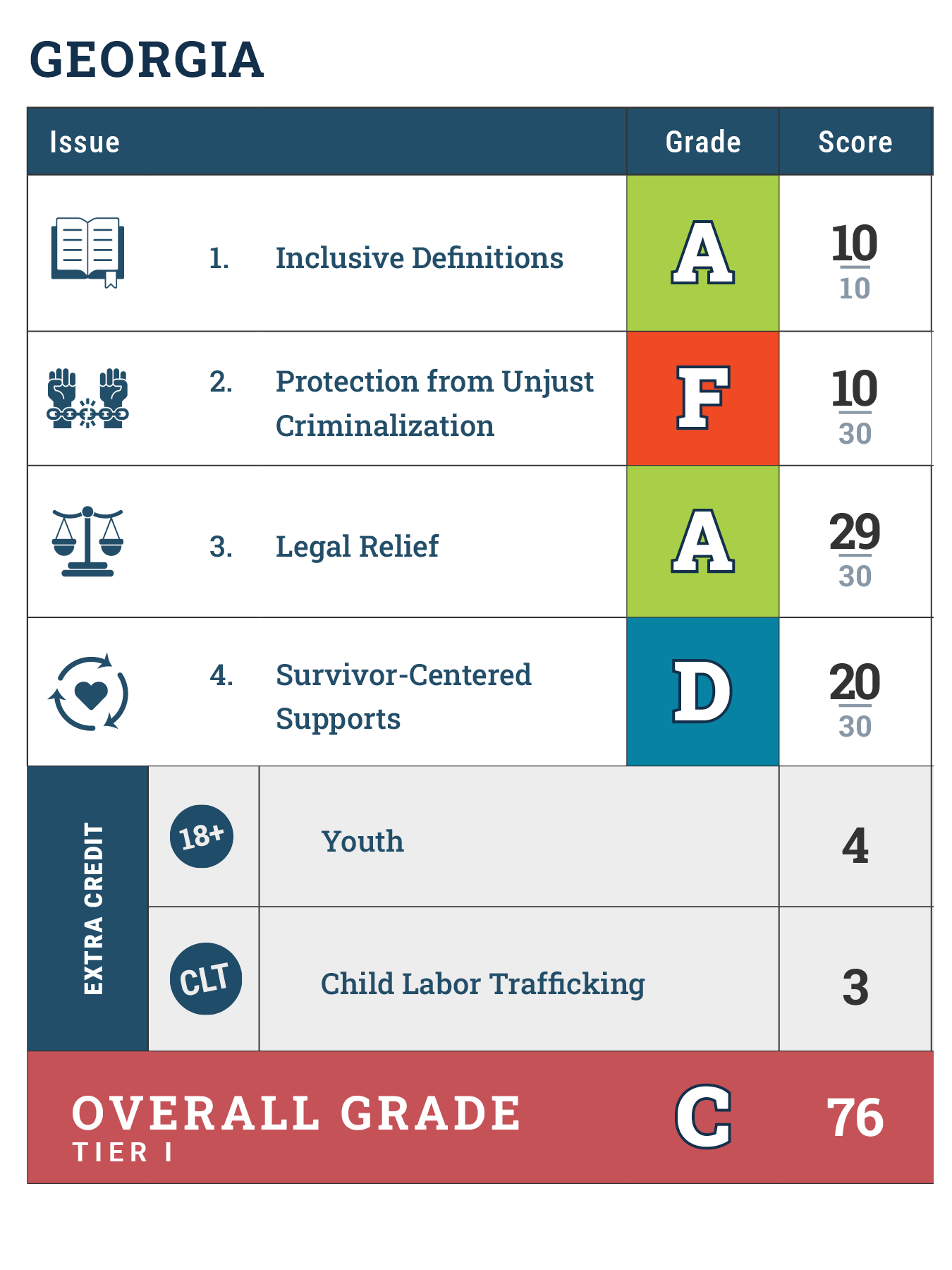 Since 2011, Shared Hope has supported policymakers and advocates in enacting key laws to combat child and youth sex trafficking. Building on this foundation, the Just Like Me Report Cards grade states based on a Top Ten list of policy goals aimed at ending the unjust criminalization of trafficking survivors and addressing its lasting impacts. This project focuses on the areas of law that have historically been hardest to shift—particularly those requiring long-term, collaborative efforts and broader cultural and systemic change. Georgia’s grades are based solely on an analysis of law. While policies, practices, and other non-legislative efforts play a vital role in addressing child and youth sex trafficking, the protections examined under the Just Like Me Report Cards must be written into law to ensure they are enforceable, equitable, consistent, and enduring.