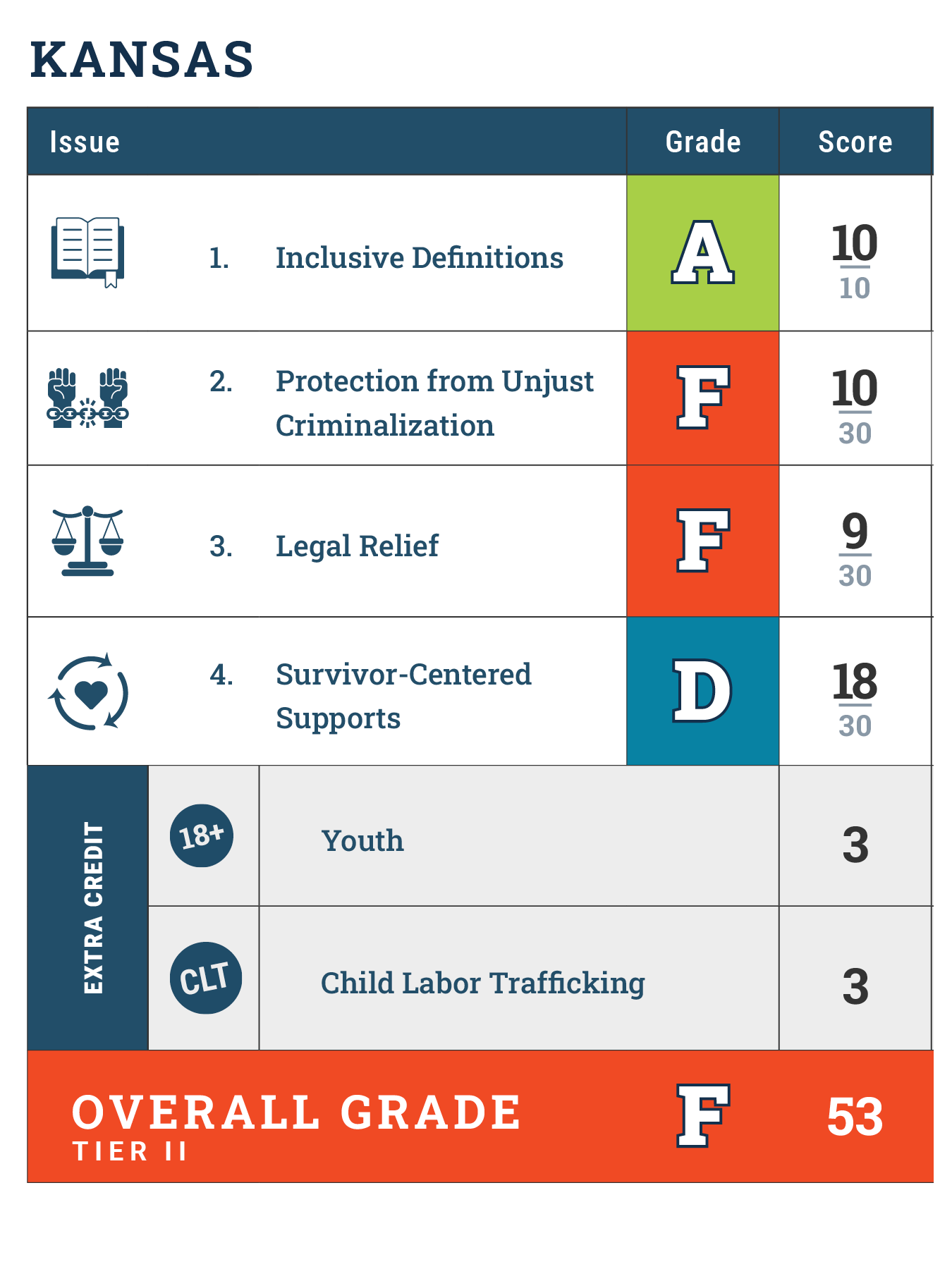 Since 2011, Shared Hope has supported policymakers and advocates in enacting key laws to combat child and youth sex trafficking. Building on this foundation, the Just Like Me Report Cards grade states based on a Top Ten list of policy goals aimed at ending the unjust criminalization of trafficking survivors and addressing its lasting impacts. This project focuses on the areas of law that have historically been hardest to shift—particularly those requiring long-term, collaborative efforts and broader cultural and systemic change. Kansas’s grades are based solely on an analysis of law. While policies, practices, and other non-legislative efforts play a vital role in addressing child and youth sex trafficking, the protections examined under the Just Like Me Report Cards must be written into law to ensure they are enforceable, equitable, consistent, and enduring.