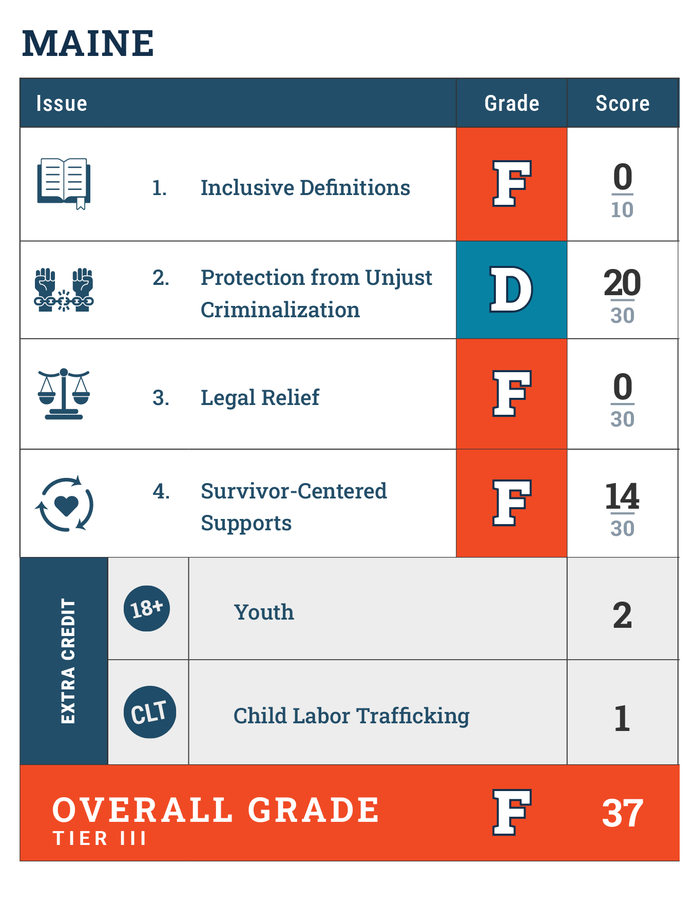 Since 2011, Shared Hope has supported policymakers and advocates in enacting key laws to combat child and youth sex trafficking. Building on this foundation, the Just Like Me Report Cards grade states based on a Top Ten list of policy goals aimed at ending the unjust criminalization of trafficking survivors and addressing its lasting impacts. This project focuses on the areas of law that have historically been hardest to shift—particularly those requiring long-term, collaborative efforts and broader cultural and systemic change. Maine’s grades are based solely on an analysis of law. While policies, practices, and other non-legislative efforts play a vital role in addressing child and youth sex trafficking, the protections examined under the Just Like Me Report Cards must be written into law to ensure they are enforceable, equitable, consistent, and enduring.