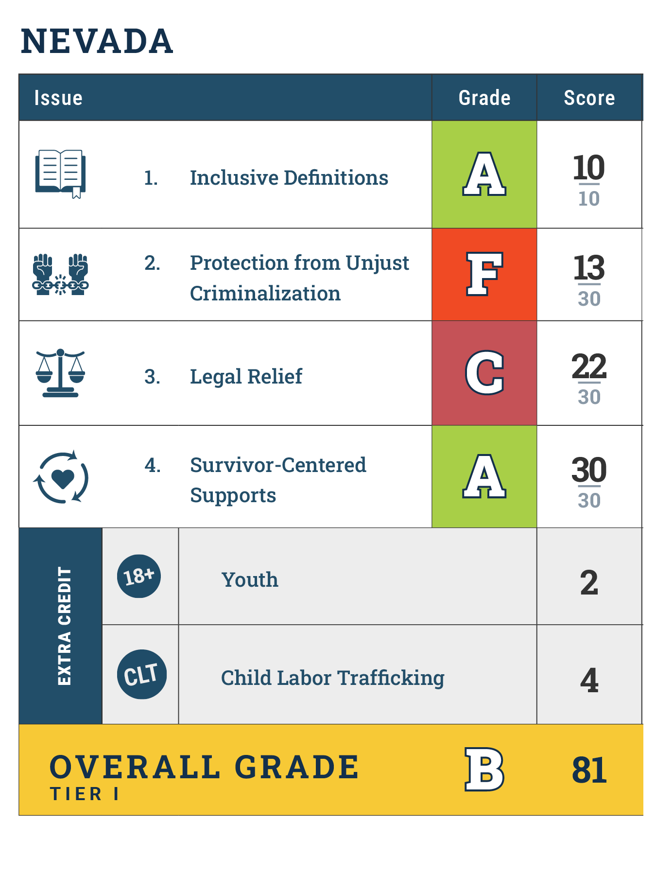Since 2011, Shared Hope has supported policymakers and advocates in enacting key laws to combat child and youth sex trafficking. Building on this foundation, the Just Like Me Report Cards grade states based on a Top Ten list of policy goals aimed at ending the unjust criminalization of trafficking survivors and addressing its lasting impacts. This project focuses on the areas of law that have historically been hardest to shift—particularly those requiring long-term, collaborative efforts and broader cultural and systemic change. Nevada’s grades are based solely on an analysis of law. While policies, practices, and other non-legislative efforts play a vital role in addressing child and youth sex trafficking, the protections examined under the Just Like Me Report Cards must be written into law to ensure they are enforceable, equitable, consistent, and enduring.