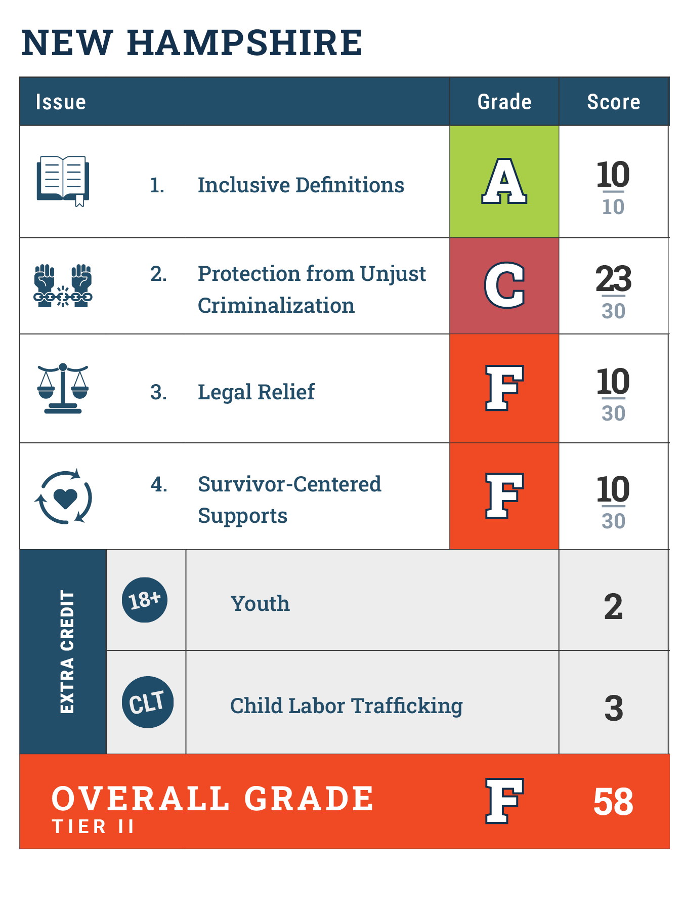 Since 2011, Shared Hope has supported policymakers and advocates in enacting key laws to combat child and youth sex trafficking. Building on this foundation, the Just Like Me Report Cards grade states based on a Top Ten list of policy goals aimed at ending the unjust criminalization of trafficking survivors and addressing its lasting impacts. This project focuses on the areas of law that have historically been hardest to shift—particularly those requiring long-term, collaborative efforts and broader cultural and systemic change. New Hampshire’s grades are based solely on an analysis of law. While policies, practices, and other non-legislative efforts play a vital role in addressing child and youth sex trafficking, the protections examined under the Just Like Me Report Cards must be written into law to ensure they are enforceable, equitable, consistent, and enduring.