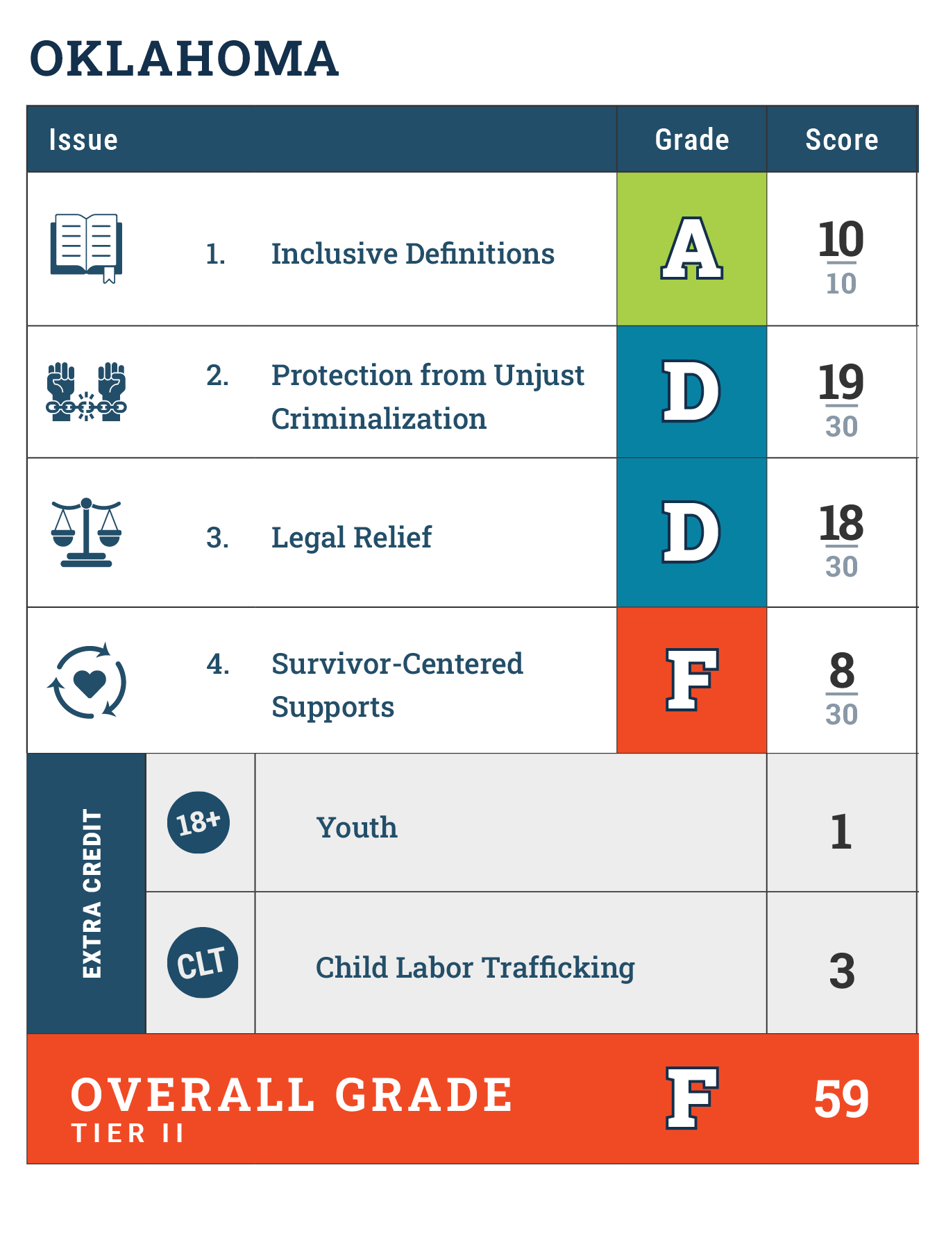 Since 2011, Shared Hope has supported policymakers and advocates in enacting key laws to combat child and youth sex trafficking. Building on this foundation, the Just Like Me Report Cards grade states based on a Top Ten list of policy goals aimed at ending the unjust criminalization of trafficking survivors and addressing its lasting impacts. This project focuses on the areas of law that have historically been hardest to shift—particularly those requiring long-term, collaborative efforts and broader cultural and systemic change. Oklahoma’s grades are based solely on an analysis of law. While policies, practices, and other non-legislative efforts play a vital role in addressing child and youth sex trafficking, the protections examined under the Just Like Me Report Cards must be written into law to ensure they are enforceable, equitable, consistent, and enduring.
