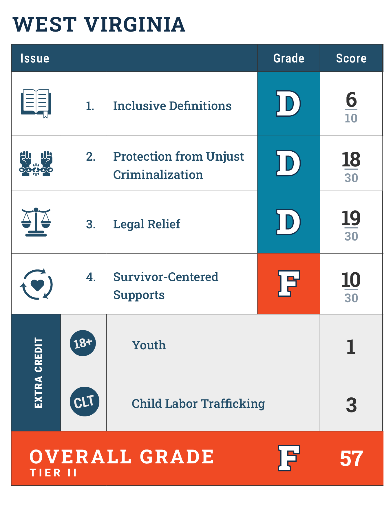 Since 2011, Shared Hope has supported policymakers and advocates in enacting key laws to combat child and youth sex trafficking. Building on this foundation, the Just Like Me Report Cards grade states based on a Top Ten list of policy goals aimed at ending the unjust criminalization of trafficking survivors and addressing its lasting impacts. This project focuses on the areas of law that have historically been hardest to shift—particularly those requiring long-term, collaborative efforts and broader cultural and systemic change. West Virginia’s grades are based solely on an analysis of law. While policies, practices, and other non-legislative efforts play a vital role in addressing child and youth sex trafficking, the protections examined under the Just Like Me Report Cards must be written into law to ensure they are enforceable, equitable, consistent, and enduring.