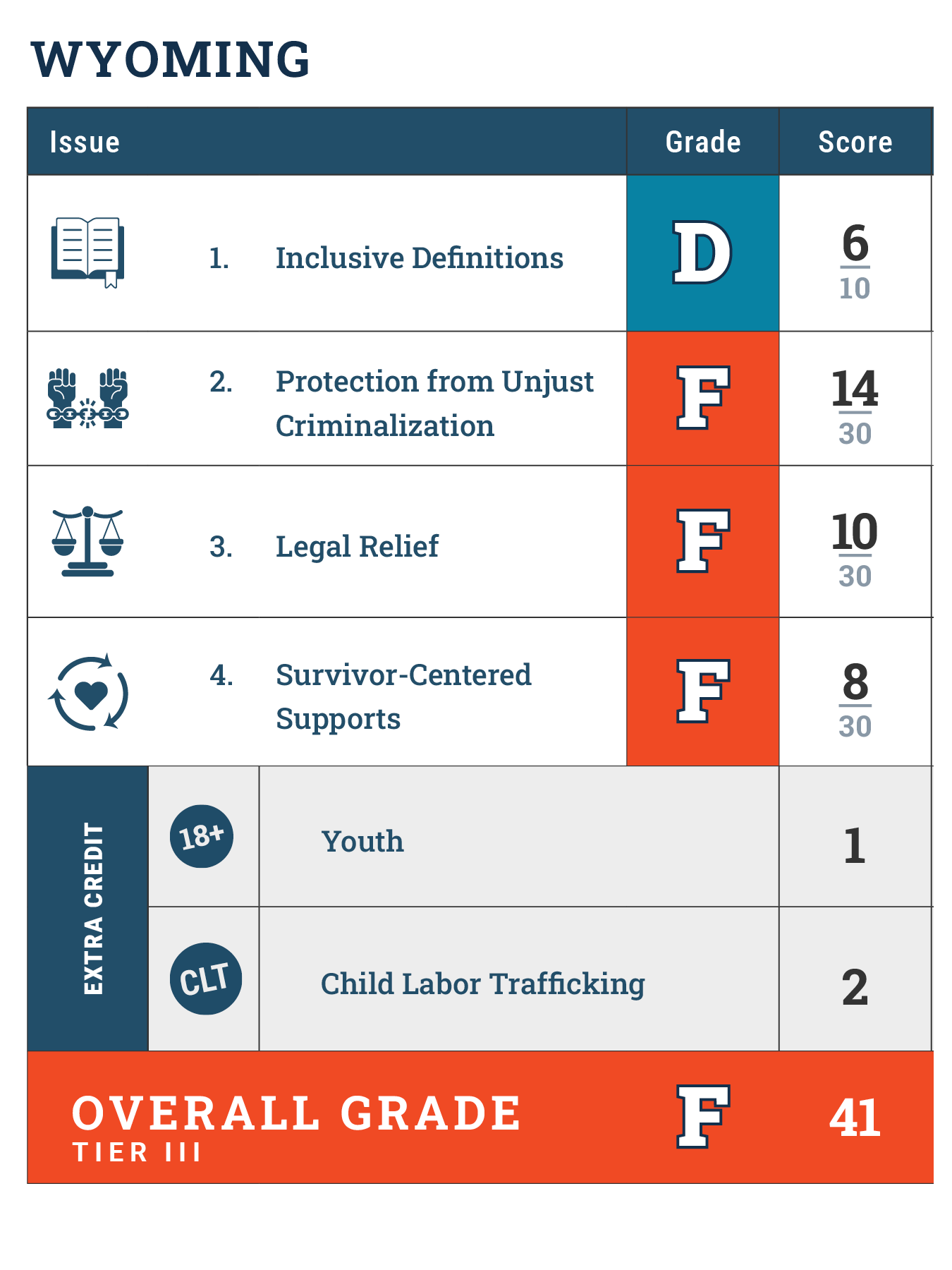 Since 2011, Shared Hope has supported policymakers and advocates in enacting key laws to combat child and youth sex trafficking. Building on this foundation, the Just Like Me Report Cards grade states based on a Top Ten list of policy goals aimed at ending the unjust criminalization of trafficking survivors and addressing its lasting impacts. This project focuses on the areas of law that have historically been hardest to shift—particularly those requiring long-term, collaborative efforts and broader cultural and systemic change. Wyoming’s grades are based solely on an analysis of law. While policies, practices, and other non-legislative efforts play a vital role in addressing child and youth sex trafficking, the protections examined under the Just Like Me Report Cards must be written into law to ensure they are enforceable, equitable, consistent, and enduring.